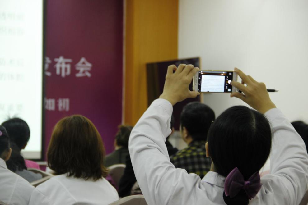 ▲我院医护人员用手机做笔记记录